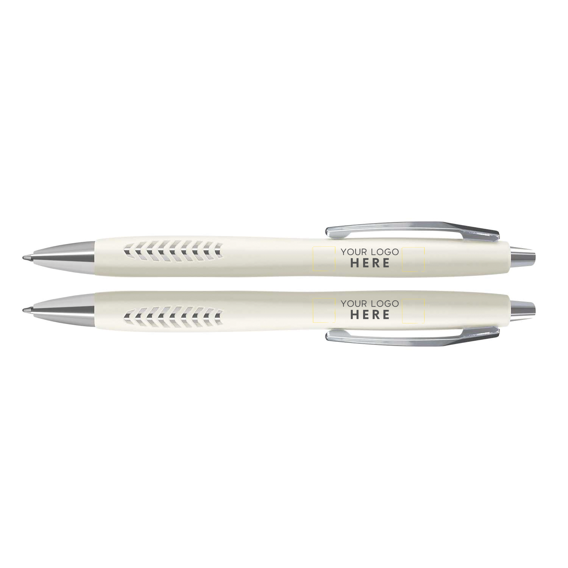 Retractable plastic ballpoint pen with a metallic barrel and shiny chrome trim. Topaz has a comfortable triangular grip with a futuristic chevron pattern that allows the shiny chrome inner barrel to show. It has a blue refill with 1800 metres of German manufactured Dokumental ink and can be presented in an optional pen sleeve.