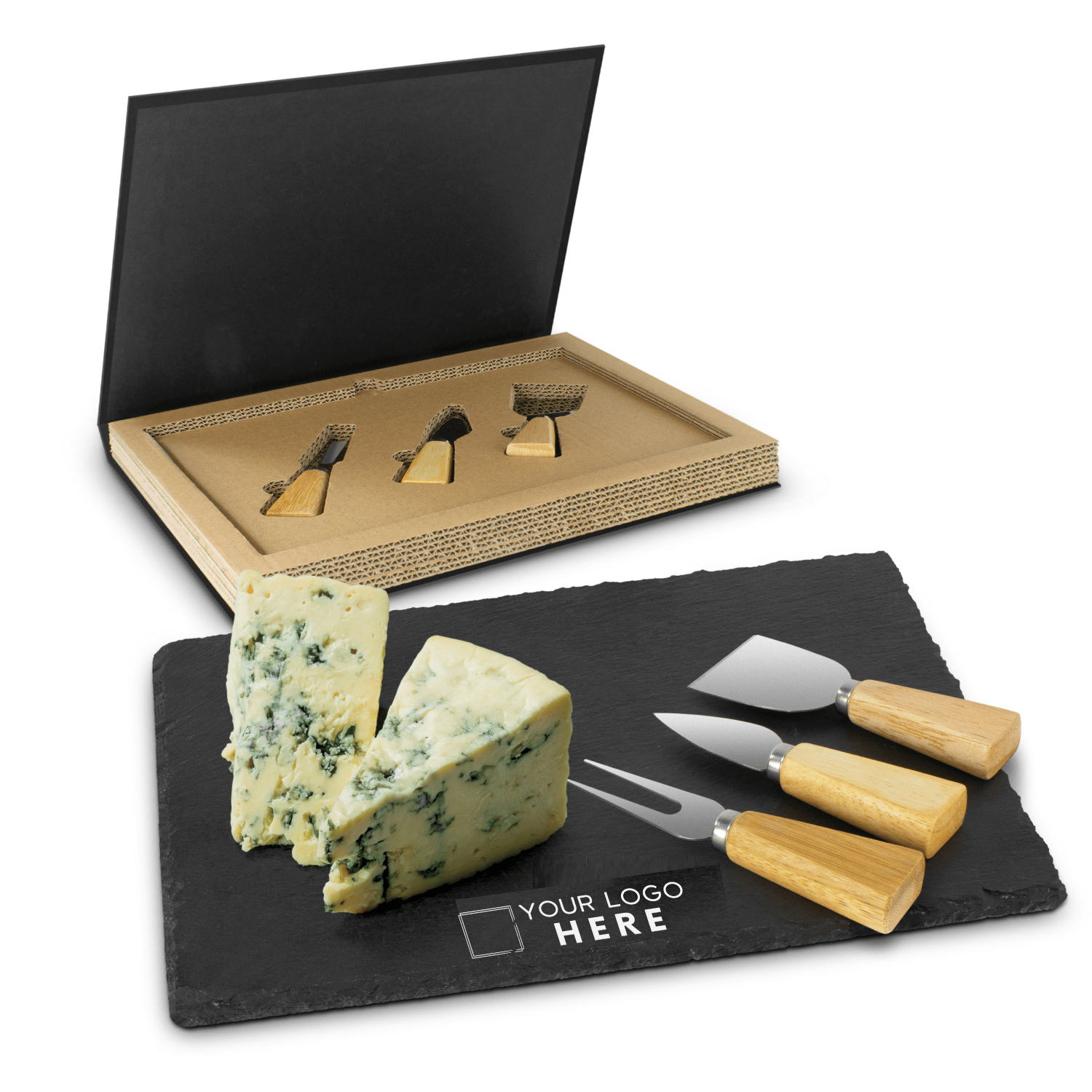 Luxury rectangular slate cheese board set which includes two cheese knives and a cheese fork with natural bamboo handles. The cheese board has non-slip polyurethane pads on the base and the set is presented in a stunning corrugated cardboard gift box that opens like a book. Bamboo and slate are natural materials which produce unavoidable variances in the grain pattern and colour.