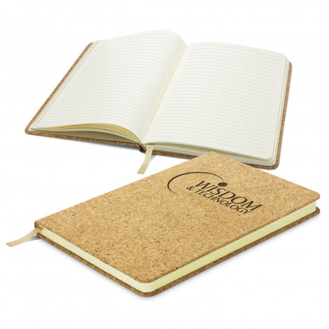 Smart medium-size notebook with a hard cover which is delightfully finished with textured natural cork. It has 80 leaves (160 pages) of high quality 80gsm lined cream paper and a bookmark ribbon. An optional paper belly band is available on request and can be branded in full colour.